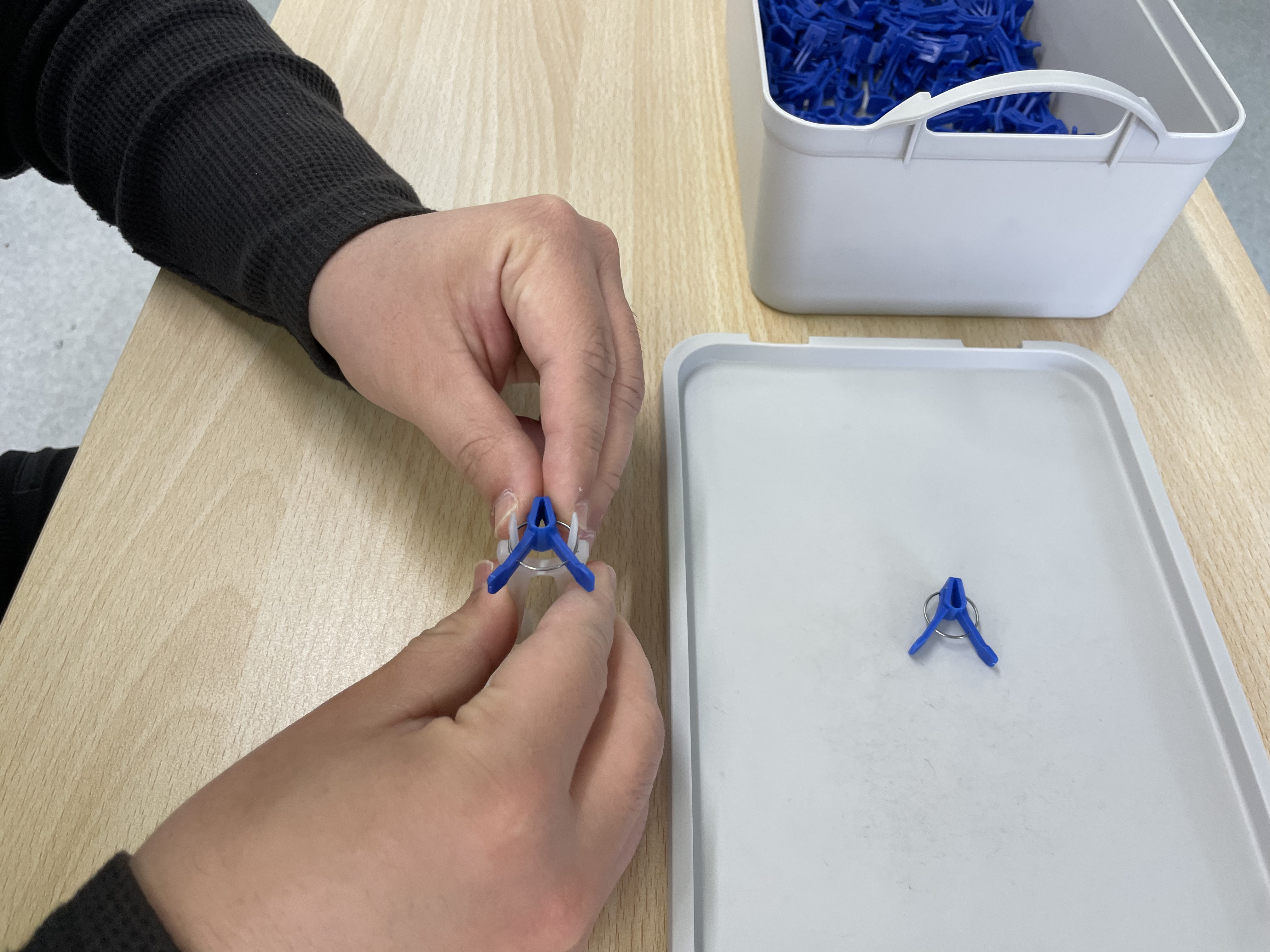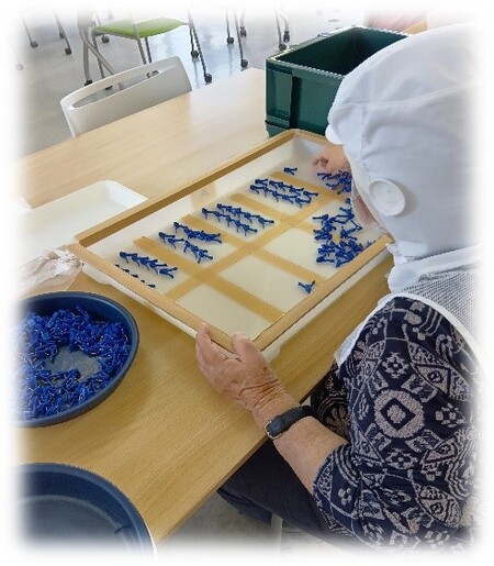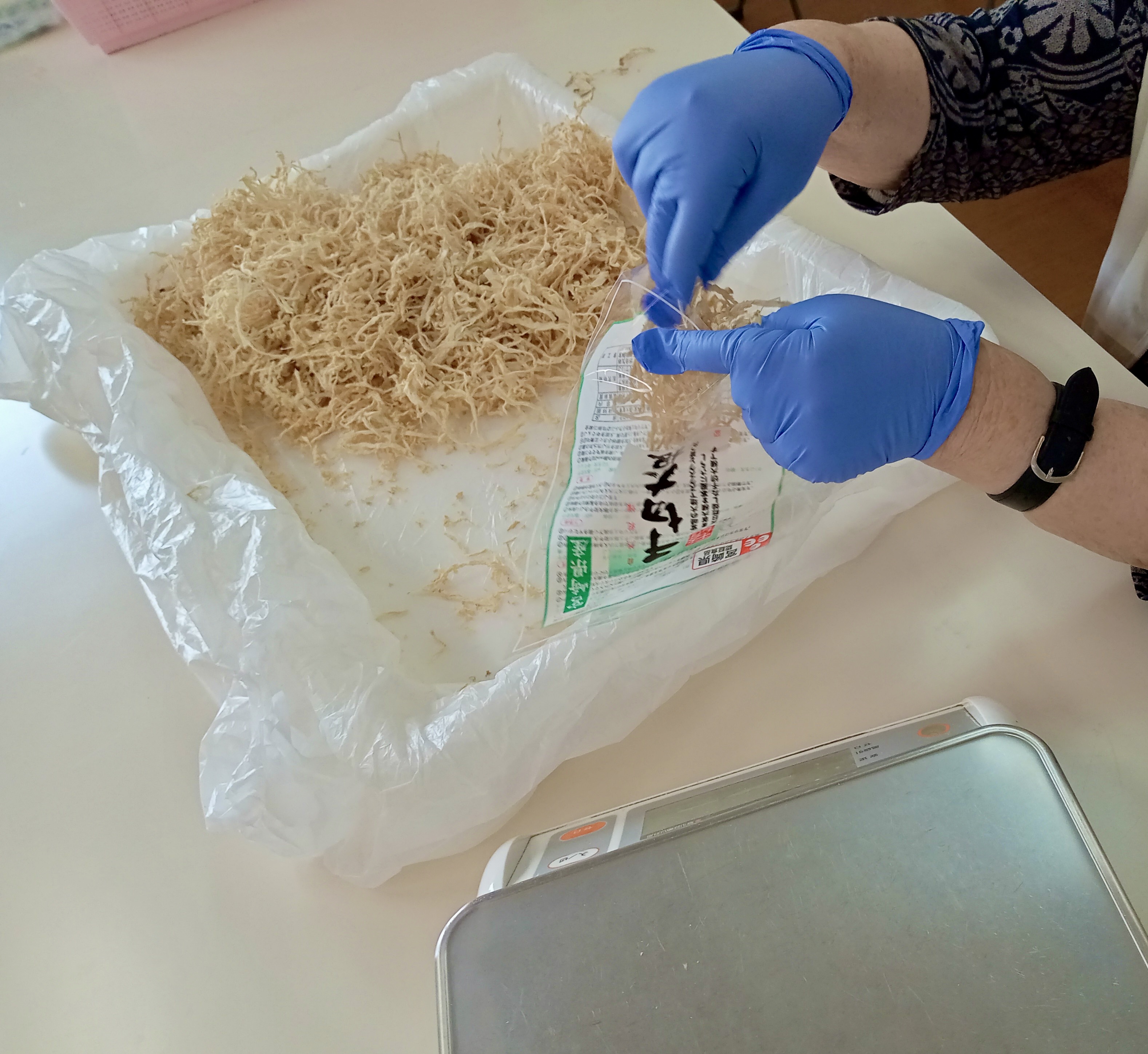 他事業所や会社から委託を受けています。衛生面に気を付けながら、一つ一つ丁寧に商品を仕上げています。座って取り組める作業です。一人一人の特性に合わせて作業配置をおこなうため、自分のペースで進めることができます。