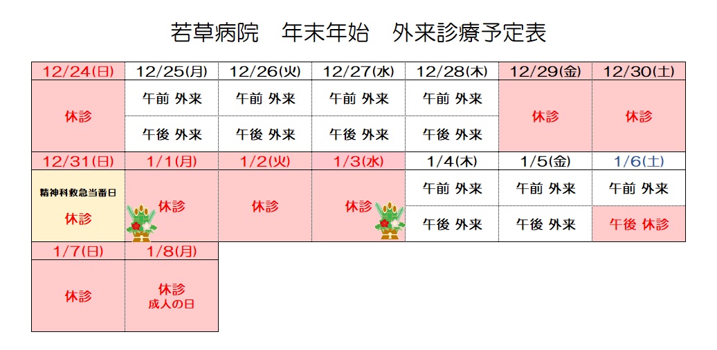 2023.12.26 トピックス 年末年始の外来診療についてのお知らせ 年末年始の外来診療につきまして、下記の通りご案内させていただきます。 ※但し、緊急の場合はこの限りではありません。 お電話にてご相談ください。 0985-28-2801 一覧に戻る