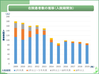 長期入院が一般化しているのは、いわゆる先進国は日本だけで、諸外国の退院患者さんの平均入院期間は20日前後です。長期入院によって社会から切り離されることで、退院をますます難しくすることがあります。そのため当院では早期退院が可能になるよう在宅支援の充実に力を入れ、デイケアの提供や訪問看護ステーションとの連携を行っています。適切な薬物療法や心理支援の効果もあり、新規の1年以上の長期入院は全入院患者の1~2%となっており、平均在院日数は70日弱と全国平均の4分の1になっています。