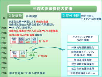 当院は1975年に開設された精神科病院です。平成23年8月から精神科救急病棟の運営を行い、夜間・休日でも必要に応じて入院の受け入れができる体制を整えています。